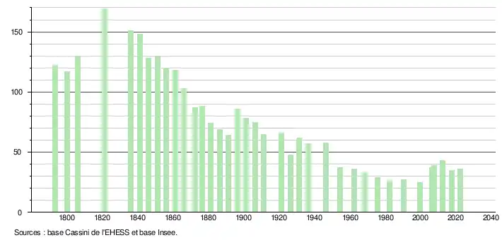 L'évolution du nombre d'habitants est connue à travers les recensements de la population effectués dans la commune depuis 1793. Pour les communes de moins de 10 000 habitants, une enquête de recensement portant sur toute la population est réalisée tous les cinq ans, les populations de référence des années intermédiaires étant quant à elles estimées par interpolation ou extrapolation[13]. Pour la commune, le premier recensement exhaustif entrant dans le cadre du nouveau dispositif a été réalisé en 2007[14].