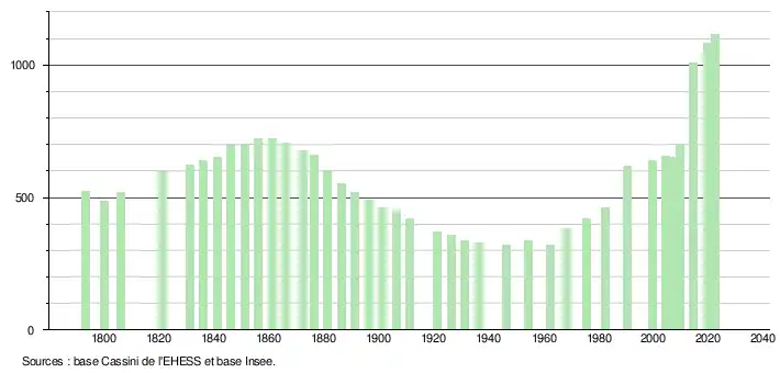 L'évolution du nombre d'habitants est connue à travers les recensements de la population effectués dans la commune depuis 1793. Pour les communes de moins de 10 000 habitants, une enquête de recensement portant sur toute la population est réalisée tous les cinq ans, les populations de référence des années intermédiaires étant quant à elles estimées par interpolation ou extrapolation[20]. Pour la commune, le premier recensement exhaustif entrant dans le cadre du nouveau dispositif a été réalisé en 2004[21].