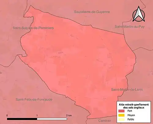 Le retrait-gonflement des sols argileux est susceptible d'engendrer des dommages importants aux bâtiments en cas d’alternance de périodes de sécheresse et de pluie. La totalité de la commune est en aléa moyen ou fort (67,4 % au niveau départemental et 48,5 % au niveau national). Sur les 43 bâtiments dénombrés sur la commune en 2019, 43 sont en aléa moyen ou fort, soit 100 %, à comparer aux 84 % au niveau départemental et 54 % au niveau national. Une cartographie de l'exposition du territoire national au retrait gonflement des sols argileux est disponible sur le site du BRGM[16],[Carte 2].