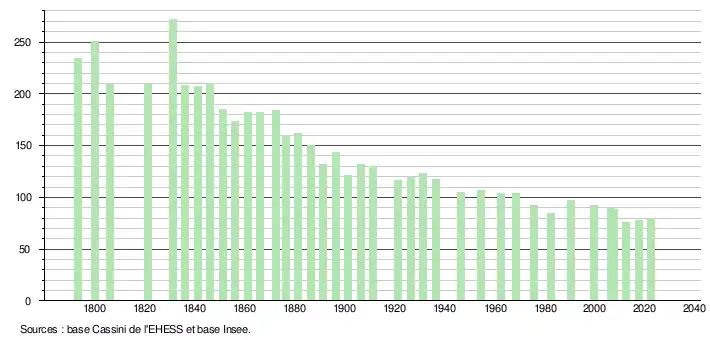 L'évolution du nombre d'habitants est connue à travers les recensements de la population effectués dans la commune depuis 1793. Pour les communes de moins de 10 000 habitants, une enquête de recensement portant sur toute la population est réalisée tous les cinq ans, les populations de référence des années intermédiaires étant quant à elles estimées par interpolation ou extrapolation[21]. Pour la commune, le premier recensement exhaustif entrant dans le cadre du nouveau dispositif a été réalisé en 2007[22].