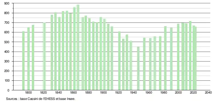 - ↑ Population municipale de référence en vigueur au 1er janvier 2025, millésimée 2022, définie dans les limites territoriales en vigueur au 1er janvier 2024, date de référence statistique : 1er janvier 2022.
