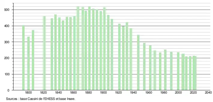 L'évolution du nombre d'habitants est connue à travers les recensements de la population effectués dans la commune depuis 1793. Pour les communes de moins de 10 000 habitants, une enquête de recensement portant sur toute la population est réalisée tous les cinq ans, les populations de référence des années intermédiaires étant quant à elles estimées par interpolation ou extrapolation[16]. Pour la commune, le premier recensement exhaustif entrant dans le cadre du nouveau dispositif a été réalisé en 2005[17].