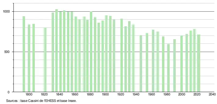 L'évolution du nombre d'habitants est connue à travers les recensements de la population effectués dans la commune depuis 1793. Pour les communes de moins de 10 000 habitants, une enquête de recensement portant sur toute la population est réalisée tous les cinq ans, les populations de référence des années intermédiaires étant quant à elles estimées par interpolation ou extrapolation[32]. Pour la commune, le premier recensement exhaustif entrant dans le cadre du nouveau dispositif a été réalisé en 2006[33].