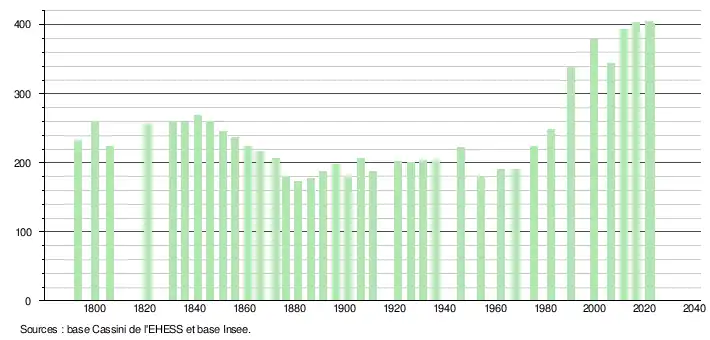 L'évolution du nombre d'habitants est connue à travers les recensements de la population effectués dans la commune depuis 1793. Pour les communes de moins de 10 000 habitants, une enquête de recensement portant sur toute la population est réalisée tous les cinq ans, les populations de référence des années intermédiaires étant quant à elles estimées par interpolation ou extrapolation[47]. Pour la commune, le premier recensement exhaustif entrant dans le cadre du nouveau dispositif a été réalisé en 2006[48].