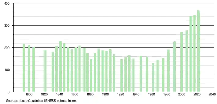 L'évolution du nombre d'habitants est connue à travers les recensements de la population effectués dans la commune depuis 1793. Pour les communes de moins de 10 000 habitants, une enquête de recensement portant sur toute la population est réalisée tous les cinq ans, les populations de référence des années intermédiaires étant quant à elles estimées par interpolation ou extrapolation[24]. Pour la commune, le premier recensement exhaustif entrant dans le cadre du nouveau dispositif a été réalisé en 2006[25].
