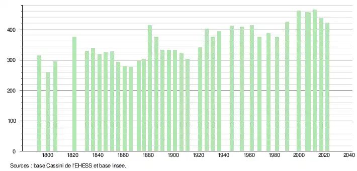 L'évolution du nombre d'habitants est connue à travers les recensements de la population effectués dans la commune depuis 1793. Pour les communes de moins de 10 000 habitants, une enquête de recensement portant sur toute la population est réalisée tous les cinq ans, les populations de référence des années intermédiaires étant quant à elles estimées par interpolation ou extrapolation[26]. Pour la commune, le premier recensement exhaustif entrant dans le cadre du nouveau dispositif a été réalisé en 2007[27].