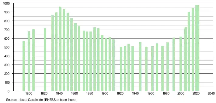 L'évolution du nombre d'habitants est connue à travers les recensements de la population effectués dans la commune depuis 1793. Pour les communes de moins de 10 000 habitants, une enquête de recensement portant sur toute la population est réalisée tous les cinq ans, les populations de référence des années intermédiaires étant quant à elles estimées par interpolation ou extrapolation[14]. Pour la commune, le premier recensement exhaustif entrant dans le cadre du nouveau dispositif a été réalisé en 2005[15].