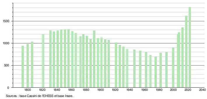 L'évolution du nombre d'habitants est connue à travers les recensements de la population effectués dans la commune depuis 1793. Pour les communes de moins de 10 000 habitants, une enquête de recensement portant sur toute la population est réalisée tous les cinq ans, les populations de référence des années intermédiaires étant quant à elles estimées par interpolation ou extrapolation[26]. Pour la commune, le premier recensement exhaustif entrant dans le cadre du nouveau dispositif a été réalisé en 2007[27].