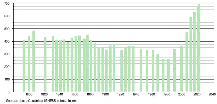 L'évolution du nombre d'habitants est connue à travers les recensements de la population effectués dans la commune depuis 1793. Pour les communes de moins de 10 000 habitants, une enquête de recensement portant sur toute la population est réalisée tous les cinq ans, les populations de référence des années intermédiaires étant quant à elles estimées par interpolation ou extrapolation[24]. Pour la commune, le premier recensement exhaustif entrant dans le cadre du nouveau dispositif a été réalisé en 2006[25].