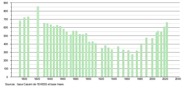 L'évolution du nombre d'habitants est connue à travers les recensements de la population effectués dans la commune depuis 1793. Pour les communes de moins de 10 000 habitants, une enquête de recensement portant sur toute la population est réalisée tous les cinq ans, les populations de référence des années intermédiaires étant quant à elles estimées par interpolation ou extrapolation[22]. Pour la commune, le premier recensement exhaustif entrant dans le cadre du nouveau dispositif a été réalisé en 2008[23].