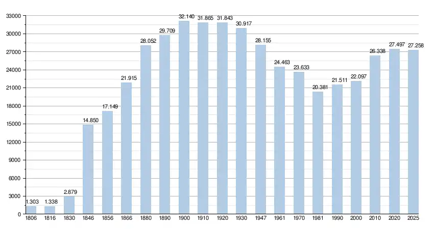| Habitants | 2.879 | 14.850 | 17.149 | 21.915 | 26.492 | 28.052 | 29.709 | 32.140 | 31.865 | 31.843 | 30.917 | 28.155 | 24.463 | 23.633 | 21.749 | 21.511 | ||||||||||||