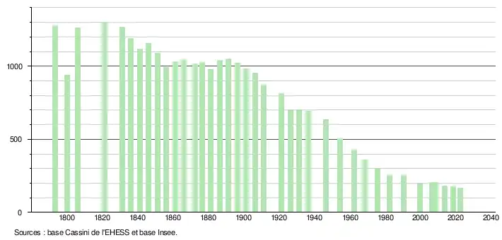 L'évolution du nombre d'habitants est connue à travers les recensements de la population effectués dans la commune depuis 1793. Pour les communes de moins de 10 000 habitants, une enquête de recensement portant sur toute la population est réalisée tous les cinq ans, les populations de référence des années intermédiaires étant quant à elles estimées par interpolation ou extrapolation[24]. Pour la commune, le premier recensement exhaustif entrant dans le cadre du nouveau dispositif a été réalisé en 2008[25].