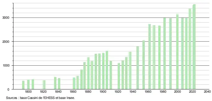 L'évolution du nombre d'habitants est connue à travers les recensements de la population effectués dans la commune depuis 1793. Pour les communes de moins de 10 000 habitants, une enquête de recensement portant sur toute la population est réalisée tous les cinq ans, les populations de référence des années intermédiaires étant quant à elles estimées par interpolation ou extrapolation[24]. Pour la commune, le premier recensement exhaustif entrant dans le cadre du nouveau dispositif a été réalisé en 2006[25].