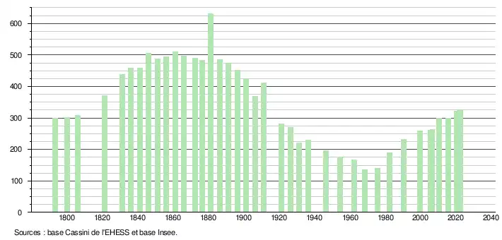 L'évolution du nombre d'habitants est connue à travers les recensements de la population effectués dans la commune depuis 1793. Pour les communes de moins de 10 000 habitants, une enquête de recensement portant sur toute la population est réalisée tous les cinq ans, les populations de référence des années intermédiaires étant quant à elles estimées par interpolation ou extrapolation[19]. Pour la commune, le premier recensement exhaustif entrant dans le cadre du nouveau dispositif a été réalisé en 2005[20].