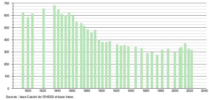 L'évolution du nombre d'habitants est connue à travers les recensements de la population effectués dans la commune depuis 1793. Pour les communes de moins de 10 000 habitants, une enquête de recensement portant sur toute la population est réalisée tous les cinq ans, les populations de référence des années intermédiaires étant quant à elles estimées par interpolation ou extrapolation[28]. Pour la commune, le premier recensement exhaustif entrant dans le cadre du nouveau dispositif a été réalisé en 2008[29].