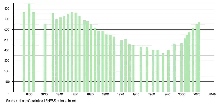L'évolution du nombre d'habitants est connue à travers les recensements de la population effectués dans la commune depuis 1793. Pour les communes de moins de 10 000 habitants, une enquête de recensement portant sur toute la population est réalisée tous les cinq ans, les populations de référence des années intermédiaires étant quant à elles estimées par interpolation ou extrapolation[15]. Pour la commune, le premier recensement exhaustif entrant dans le cadre du nouveau dispositif a été réalisé en 2004[16].