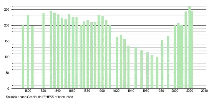 L'évolution du nombre d'habitants est connue à travers les recensements de la population effectués dans la commune depuis 1793. Pour les communes de moins de 10 000 habitants, une enquête de recensement portant sur toute la population est réalisée tous les cinq ans, les populations de référence des années intermédiaires étant quant à elles estimées par interpolation ou extrapolation[41]. Pour la commune, le premier recensement exhaustif entrant dans le cadre du nouveau dispositif a été réalisé en 2004[42].