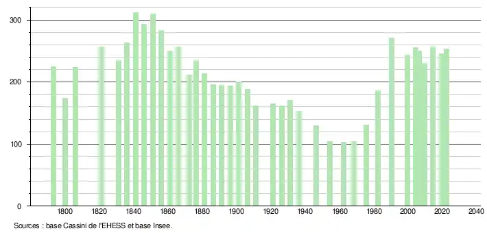L'évolution du nombre d'habitants est connue à travers les recensements de la population effectués dans la commune depuis 1793. Pour les communes de moins de 10 000 habitants, une enquête de recensement portant sur toute la population est réalisée tous les cinq ans, les populations de référence des années intermédiaires étant quant à elles estimées par interpolation ou extrapolation[18]. Pour la commune, le premier recensement exhaustif entrant dans le cadre du nouveau dispositif a été réalisé en 2004[19].