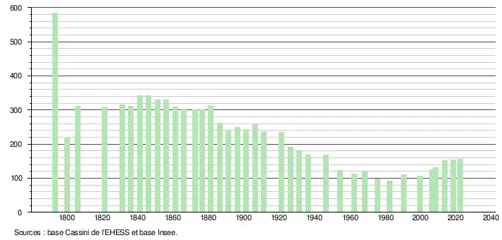 L'évolution du nombre d'habitants est connue à travers les recensements de la population effectués dans la commune depuis 1793. Pour les communes de moins de 10 000 habitants, une enquête de recensement portant sur toute la population est réalisée tous les cinq ans, les populations de référence des années intermédiaires étant quant à elles estimées par interpolation ou extrapolation[16]. Pour la commune, le premier recensement exhaustif entrant dans le cadre du nouveau dispositif a été réalisé en 2008[17].