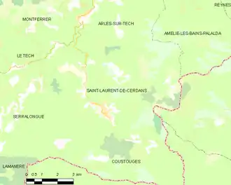 La superficie de la commune est de 4 508 hectares. L'altitude de Saint-Laurent-de-Cerdans varie entre 382 et 1 305 mètres[8].