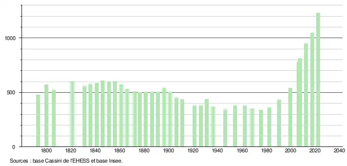 L'évolution du nombre d'habitants est connue à travers les recensements de la population effectués dans la commune depuis 1793. Pour les communes de moins de 10 000 habitants, une enquête de recensement portant sur toute la population est réalisée tous les cinq ans, les populations de référence des années intermédiaires étant quant à elles estimées par interpolation ou extrapolation[34]. Pour la commune, le premier recensement exhaustif entrant dans le cadre du nouveau dispositif a été réalisé en 2007[35].