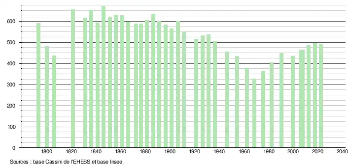 - ↑ Population municipale de référence en vigueur au 1er janvier 2025, millésimée 2022, définie dans les limites territoriales en vigueur au 1er janvier 2024, date de référence statistique : 1er janvier 2022.