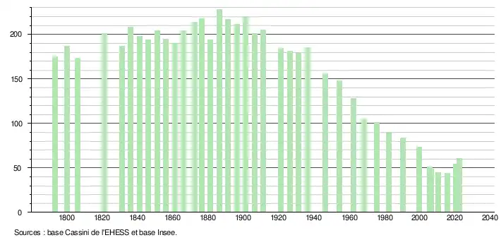 L'évolution du nombre d'habitants est connue à travers les recensements de la population effectués dans la commune depuis 1793. Pour les communes de moins de 10 000 habitants, une enquête de recensement portant sur toute la population est réalisée tous les cinq ans, les populations de référence des années intermédiaires étant quant à elles estimées par interpolation ou extrapolation[30]. Pour la commune, le premier recensement exhaustif entrant dans le cadre du nouveau dispositif a été réalisé en 2005[31].