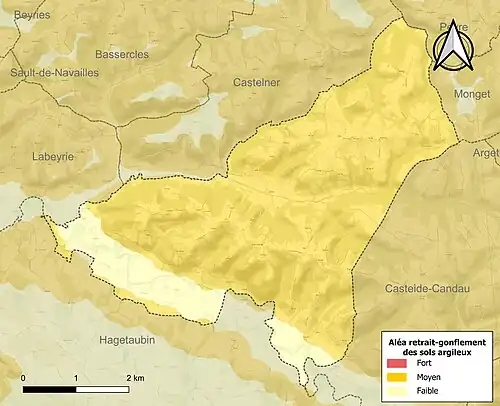 Le retrait-gonflement des sols argileux est susceptible d'engendrer des dommages importants aux bâtiments en cas d’alternance de périodes de sécheresse et de pluie[28]. 86,7 % de la superficie communale est en aléa moyen ou fort (59 % au niveau départemental et 48,5 % au niveau national)[Carte 3]. Depuis le , en application de la loi ELAN, différentes contraintes s'imposent aux vendeurs, maîtres d'ouvrages ou constructeurs de biens situés dans une zone classée en aléa moyen ou fort[Note 4],[29].