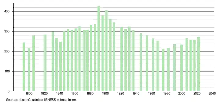 L'évolution du nombre d'habitants est connue à travers les recensements de la population effectués dans la commune depuis 1793. Pour les communes de moins de 10 000 habitants, une enquête de recensement portant sur toute la population est réalisée tous les cinq ans, les populations de référence des années intermédiaires étant quant à elles estimées par interpolation ou extrapolation[22]. Pour la commune, le premier recensement exhaustif entrant dans le cadre du nouveau dispositif a été réalisé en 2006[23].