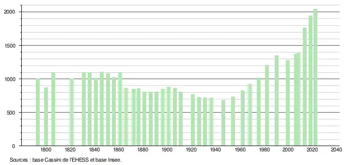 L'évolution du nombre d'habitants est connue à travers les recensements de la population effectués dans la commune depuis 1793. Pour les communes de moins de 10 000 habitants, une enquête de recensement portant sur toute la population est réalisée tous les cinq ans, les populations de référence des années intermédiaires étant quant à elles estimées par interpolation ou extrapolation[24]. Pour la commune, le premier recensement exhaustif entrant dans le cadre du nouveau dispositif a été réalisé en 2008[25].