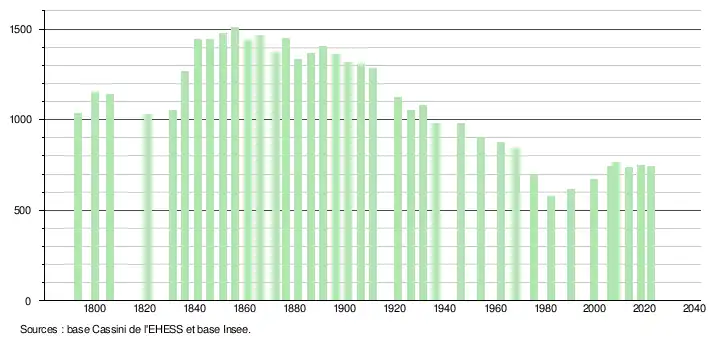 L'évolution du nombre d'habitants est connue à travers les recensements de la population effectués dans la commune depuis 1793. Pour les communes de moins de 10 000 habitants, une enquête de recensement portant sur toute la population est réalisée tous les cinq ans, les populations de référence des années intermédiaires étant quant à elles estimées par interpolation ou extrapolation[18]. Pour la commune, le premier recensement exhaustif entrant dans le cadre du nouveau dispositif a été réalisé en 2008[19].
