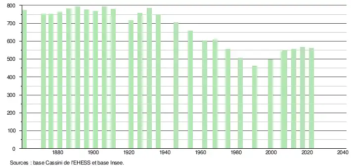 L'évolution du nombre d'habitants est connue à travers les recensements de la population effectués dans la commune depuis 1861. Pour les communes de moins de 10 000 habitants, une enquête de recensement portant sur toute la population est réalisée tous les cinq ans, les populations de référence des années intermédiaires étant quant à elles estimées par interpolation ou extrapolation[23]. Pour la commune, le premier recensement exhaustif entrant dans le cadre du nouveau dispositif a été réalisé en 2007[24].