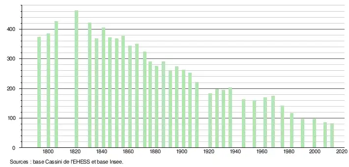 - ↑ Par convention dans Wikipédia, le principe a été retenu de n’afficher dans le tableau des recensements et le graphique, pour les populations légales postérieures à 1999, que les populations correspondant à une enquête exhaustive de recensement pour les communes de moins de 10 000 habitants, et que les populations des années 2006, 2011, 2016, etc. pour les communes de plus de 10 000 habitants, ainsi que la dernière population légale publiée par l’Insee pour l'ensemble des communes.