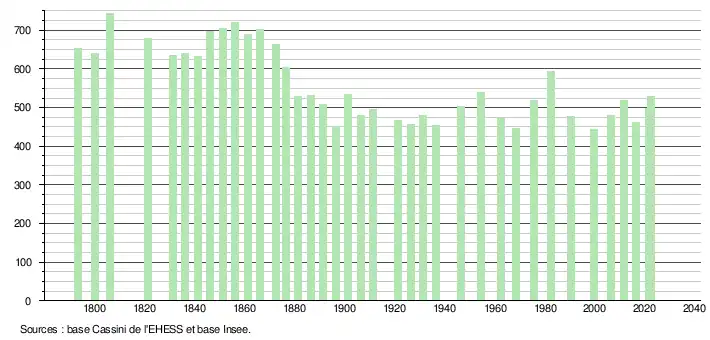 L'évolution du nombre d'habitants est connue à travers les recensements de la population effectués dans la commune depuis 1793. Pour les communes de moins de 10 000 habitants, une enquête de recensement portant sur toute la population est réalisée tous les cinq ans, les populations de référence des années intermédiaires étant quant à elles estimées par interpolation ou extrapolation[31]. Pour la commune, le premier recensement exhaustif entrant dans le cadre du nouveau dispositif a été réalisé en 2006[32].