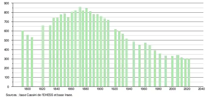 L'évolution du nombre d'habitants est connue à travers les recensements de la population effectués dans la commune depuis 1793. Pour les communes de moins de 10 000 habitants, une enquête de recensement portant sur toute la population est réalisée tous les cinq ans, les populations de référence des années intermédiaires étant quant à elles estimées par interpolation ou extrapolation[18]. Pour la commune, le premier recensement exhaustif entrant dans le cadre du nouveau dispositif a été réalisé en 2007[19].