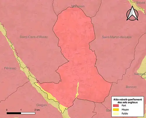 Le retrait-gonflement des sols argileux est susceptible d'engendrer des dommages importants aux bâtiments en cas d’alternance de périodes de sécheresse et de pluie. La totalité de la commune est en aléa moyen ou fort (67,4 % au niveau départemental et 48,5 % au niveau national). Sur les 349 bâtiments dénombrés sur la commune en 2019, 349 sont en aléa moyen ou fort, soit 100 %, à comparer aux 84 % au niveau départemental et 54 % au niveau national. Une cartographie de l'exposition du territoire national au retrait gonflement des sols argileux est disponible sur le site du BRGM[16],[Carte 2].