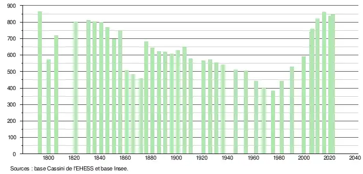 L'évolution du nombre d'habitants est connue à travers les recensements de la population effectués dans la commune depuis 1793. Pour les communes de moins de 10 000 habitants, une enquête de recensement portant sur toute la population est réalisée tous les cinq ans, les populations de référence des années intermédiaires étant quant à elles estimées par interpolation ou extrapolation[17]. Pour la commune, le premier recensement exhaustif entrant dans le cadre du nouveau dispositif a été réalisé en 2005[18].