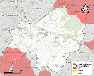 Les mouvements de terrains susceptibles de se produire sur la commune sont des tassements différentiels[16]. Le retrait-gonflement des sols argileux est susceptible d'engendrer des dommages importants aux bâtiments en cas d’alternance de périodes de sécheresse et de pluie[17]. 10,7 % de la superficie communale est en aléa moyen ou fort (54,9 % au niveau départemental et 48,5 % au niveau national)[Carte 2]. Depuis le , en application de la loi ELAN, différentes contraintes s'imposent aux vendeurs, maîtres d'ouvrages ou constructeurs de biens situés dans une zone classée en aléa moyen ou fort[Note 2],[18].