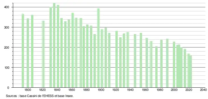 L'évolution du nombre d'habitants est connue à travers les recensements de la population effectués dans la commune depuis 1793. Pour les communes de moins de 10 000 habitants, une enquête de recensement portant sur toute la population est réalisée tous les cinq ans, les populations de référence des années intermédiaires étant quant à elles estimées par interpolation ou extrapolation[20]. Pour la commune, le premier recensement exhaustif entrant dans le cadre du nouveau dispositif a été réalisé en 2004[21].
