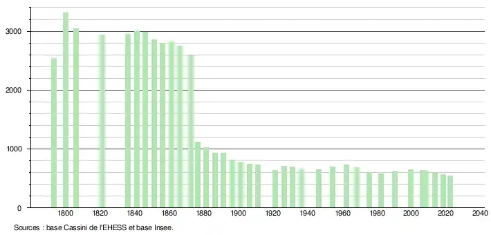 L'évolution du nombre d'habitants est connue à travers les recensements de la population effectués dans la commune depuis 1793. Pour les communes de moins de 10 000 habitants, une enquête de recensement portant sur toute la population est réalisée tous les cinq ans, les populations de référence des années intermédiaires étant quant à elles estimées par interpolation ou extrapolation[25]. Pour la commune, le premier recensement exhaustif entrant dans le cadre du nouveau dispositif a été réalisé en 2008[26].