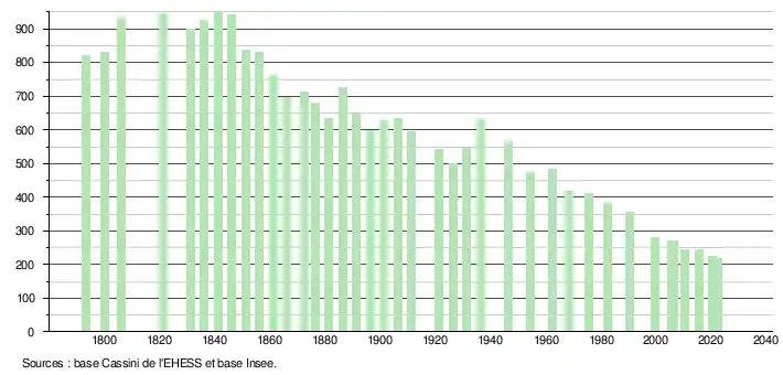 L'évolution du nombre d'habitants est connue à travers les recensements de la population effectués dans la commune depuis 1793. Pour les communes de moins de 10 000 habitants, une enquête de recensement portant sur toute la population est réalisée tous les cinq ans, les populations de référence des années intermédiaires étant quant à elles estimées par interpolation ou extrapolation[13]. Pour la commune, le premier recensement exhaustif entrant dans le cadre du nouveau dispositif a été réalisé en 2005[14].