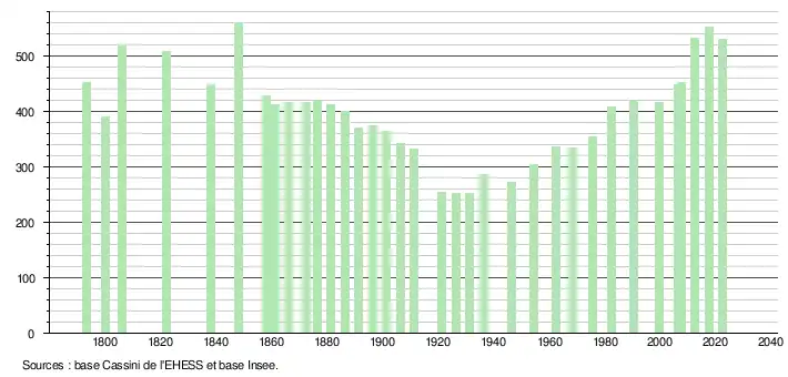L'évolution du nombre d'habitants est connue à travers les recensements de la population effectués dans la commune depuis 1793. Pour les communes de moins de 10 000 habitants, une enquête de recensement portant sur toute la population est réalisée tous les cinq ans, les populations de référence des années intermédiaires étant quant à elles estimées par interpolation ou extrapolation[16]. Pour la commune, le premier recensement exhaustif entrant dans le cadre du nouveau dispositif a été réalisé en 2007[17].