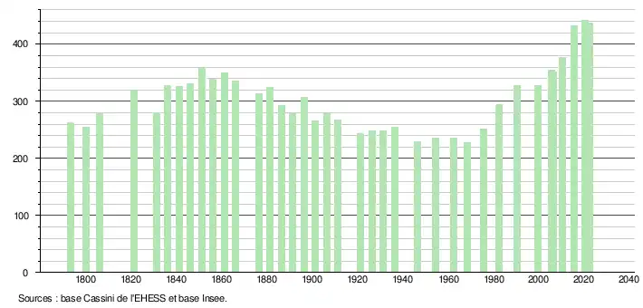 - ↑ Population municipale de référence en vigueur au 1er janvier 2025, millésimée 2022, définie dans les limites territoriales en vigueur au 1er janvier 2024, date de référence statistique : 1er janvier 2022.