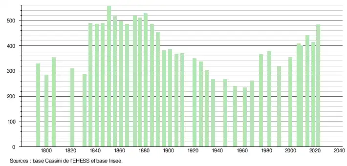 L'évolution du nombre d'habitants est connue à travers les recensements de la population effectués dans la commune depuis 1793. Pour les communes de moins de 10 000 habitants, une enquête de recensement portant sur toute la population est réalisée tous les cinq ans, les populations de référence des années intermédiaires étant quant à elles estimées par interpolation ou extrapolation[21]. Pour la commune, le premier recensement exhaustif entrant dans le cadre du nouveau dispositif a été réalisé en 2008[22].