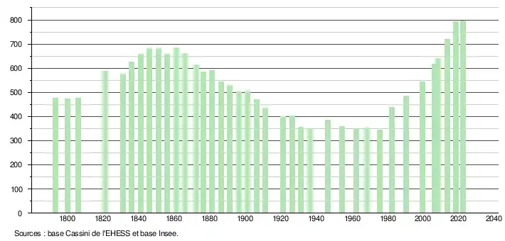 L'évolution du nombre d'habitants est connue à travers les recensements de la population effectués dans la commune depuis 1793. Pour les communes de moins de 10 000 habitants, une enquête de recensement portant sur toute la population est réalisée tous les cinq ans, les populations de référence des années intermédiaires étant quant à elles estimées par interpolation ou extrapolation[16]. Pour la commune, le premier recensement exhaustif entrant dans le cadre du nouveau dispositif a été réalisé en 2008[17].