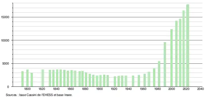 - ↑ Par convention dans Wikipédia, le principe a été retenu de n’afficher dans le tableau des recensements et le graphique, pour les populations de référence postérieures à 1999, que les populations correspondant à une enquête exhaustive de recensement pour les communes de moins de 10 000 habitants, et que les populations des années 2006, 2011, 2016, etc. pour les communes de plus de 10 000 habitants, ainsi que la dernière population de référence publiée par l’Insee pour l'ensemble des communes.