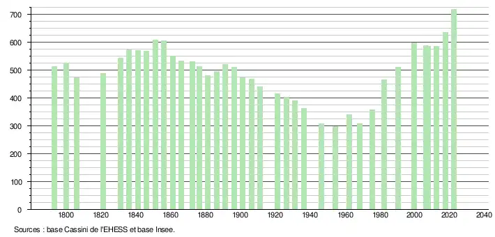 L'évolution du nombre d'habitants est connue à travers les recensements de la population effectués dans la commune depuis 1793. Pour les communes de moins de 10 000 habitants, une enquête de recensement portant sur toute la population est réalisée tous les cinq ans, les populations de référence des années intermédiaires étant quant à elles estimées par interpolation ou extrapolation[26]. Pour la commune, le premier recensement exhaustif entrant dans le cadre du nouveau dispositif a été réalisé en 2007[27].