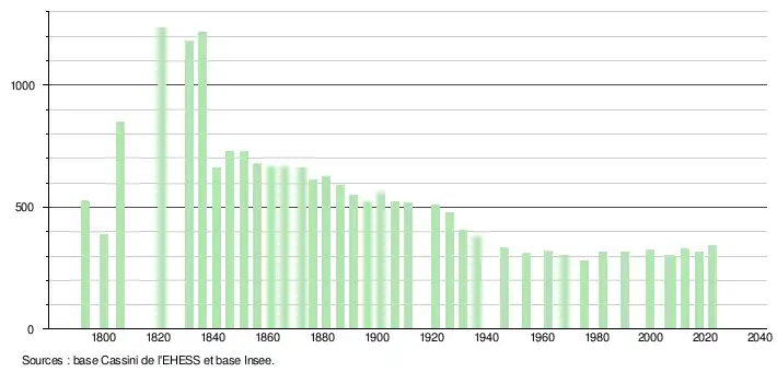 L'évolution du nombre d'habitants est connue à travers les recensements de la population effectués dans la commune depuis 1793. Pour les communes de moins de 10 000 habitants, une enquête de recensement portant sur toute la population est réalisée tous les cinq ans, les populations de référence des années intermédiaires étant quant à elles estimées par interpolation ou extrapolation[30]. Pour la commune, le premier recensement exhaustif entrant dans le cadre du nouveau dispositif a été réalisé en 2007[31].