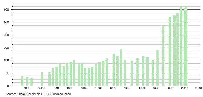 L'évolution du nombre d'habitants est connue à travers les recensements de la population effectués dans la commune depuis 1793. Pour les communes de moins de 10 000 habitants, une enquête de recensement portant sur toute la population est réalisée tous les cinq ans, les populations de référence des années intermédiaires étant quant à elles estimées par interpolation ou extrapolation[30]. Pour la commune, le premier recensement exhaustif entrant dans le cadre du nouveau dispositif a été réalisé en 2005[31].