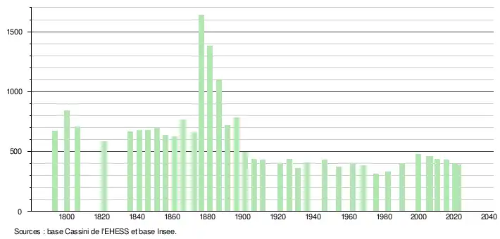 L'évolution du nombre d'habitants est connue à travers les recensements de la population effectués dans la commune depuis 1793. Pour les communes de moins de 10 000 habitants, une enquête de recensement portant sur toute la population est réalisée tous les cinq ans, les populations de référence des années intermédiaires étant quant à elles estimées par interpolation ou extrapolation[14]. Pour la commune, le premier recensement exhaustif entrant dans le cadre du nouveau dispositif a été réalisé en 2005[15].